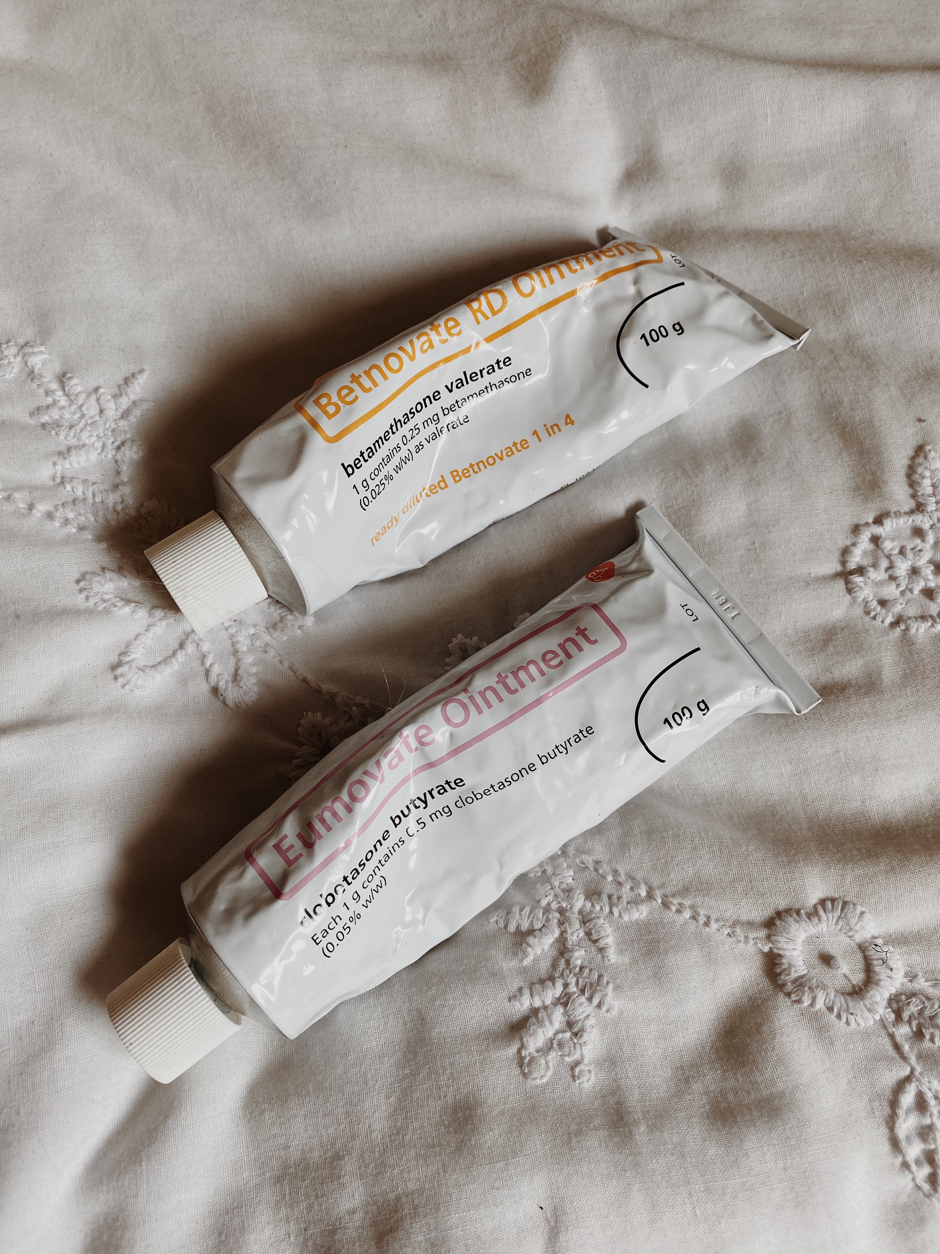 Over Christmas I was using dermovate all over my body, even my neck!! and on my face was eumovate cream. Between Christmas and my first dermatologist appointment in March I used these every other day and despite using them I still had red stubborn patches. After my appointment I then was put onto betnovate RD and eumovate ointment as he decided that ointment was a better option to the cream. My understanding is that these are more targeted? And the betnovate RD was used to just keep me ticking over and the RD stands for ready diluted (contains less active ingredient than betnovate).