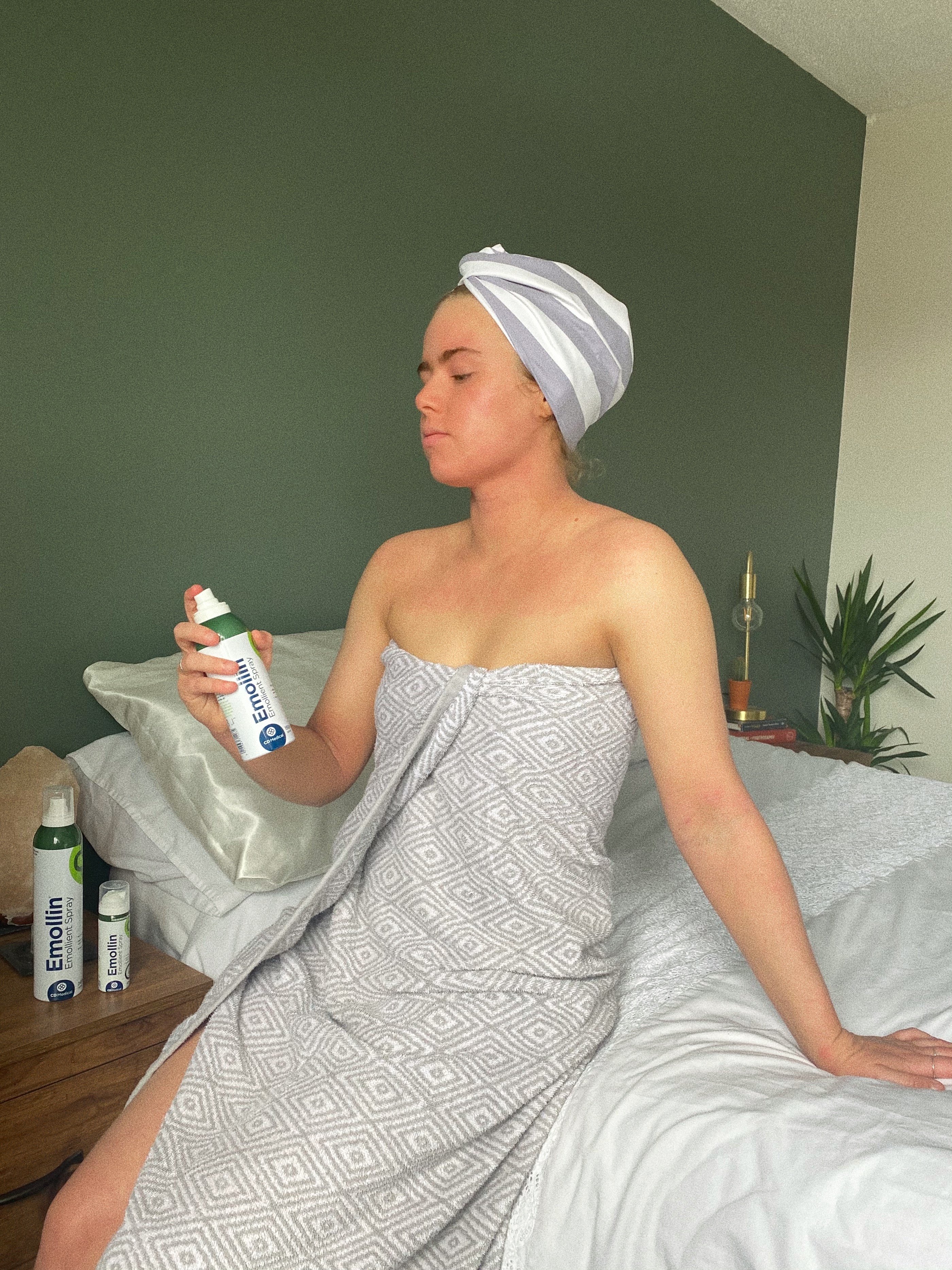 I have also recently discovered the ultimate pre bed hydration routine where I spray the Emollin as soon as I come out of the bath, let it soak in slightly then apply my gel-based emollient. This gives my skin the best possible chance at not drying out too much whilst I sleep as I often wake up sore and flakey when I haven’t given my skin enough hydration in the evening.